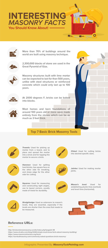 Here is an infographic which shares few facts and figures about masonry and brick masonry tools which you should consider when hiring a masonry contractor. Find more information about masonry contractors online on parapet wall repair.